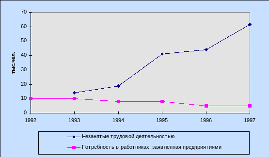 В течение прошедших лет напряженность на рынке труда была неоднозначной и зависела, прежде всего, от наличия вакансий. Из рис.2.3 видно, что начиная с 1993 года потребность в работниках, заявленная предприятиями уменьшилась. В то же время численность безработных увеличивалась значительными темпами. В начале 1997 года на одну заявленную в органы службы занятости вакансию претендовали 11 зарегистрированных незанятых граждан. Для летнего периода характерно наличие в целом по республике довольно большого количества вакансий, что значительно смягчает напряженность на рынке труда. Однако, в декабре ситуация с наличием свободных рабочих мест изменилась, вследствие чего на одну вакансию было 9 претендентов. При этом в 30 городах и районах этот показатель более чем в 2 раза превысил среднереспубликанский и составил от 19 человек на одно вакантное место до 180 (Калтасинский район).