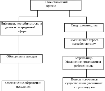 Особенность сложившейся в настоящее время в российской экономике ситуации состоит в том, что старые производственные структуры, оказавшиеся неспособными адаптироваться к изменившемся условиям, испытывают на себе наиболее сильное влияние кризиса, обуславливая глубину спада производства. Сокращение объёмов производства в них пока не компенсируется его увеличением на новых или модернизированных предприятиях. Частный капитал продолжает накапливаться в сфере обращения и финансовом секторе, поскольку инвестирование в промышленность чревато большим риском и малыми выгодами. Особенно ощутимо влияние экономического кризиса на ситуацию в социально – трудовой сфере (Рис.1.6). Всё это приводит к тому, что преобразования, происходящие в социально – трудовой сфере, имеют противоречивый характер. Поэтому при решении проблемы занятости важно учитывать специфические черты российской