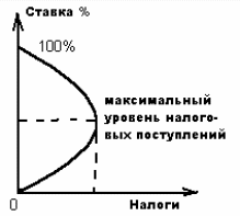 по мере роста ставки налога от 0 до 100 % налоговые поступления будут расти до некоторой точки максимума, а затем снижаться до нуля. Налоговые поступления после этой точки падают потому, что более высокие налоговые ставки, по предположению сдерживают экономическую активность и, следовательно, сокращают налогооблагаемую базу. Т.е. при условии нахождения точки ставки налогов выше оптимума снижение ставки налога приведёт не к снижению, а к росту налоговых поступлений.