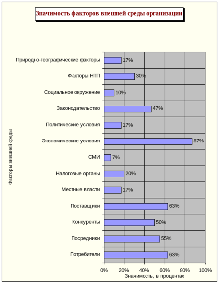 В завершении вышерассмотренной темы хочется отметить следующие определяющие моменты, которые определяют высокую степень значимости этой проблемы. На сегодняшний день внешняя среда имеет важное значение для всех без исключения организаций. В целях выживания и развития в условиях чрезвычайно динамичной и неопределенной внешней среды (а это является общими характеристиками современного окружения отечественных промышленных предприятий) организациям необходимо приспосабливаться к изменениям, а также самим активно формировать свое будущее. Поэтому определяющее значение в рыночных условиях играет стратегическое управление, информационной основой которого является анализ макро- и микроокружения организации.