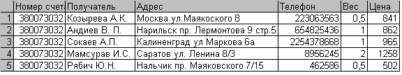 Пункт меню “Получатель” вызывает работу окна “Получатель”, в котором происходит заполнение данных о получатели. Это окно не обязательно для заполнения его пользователем, но здесь можно просмотреть все данные об получатели, когда – либо получаемого что – ни будь с помощью этой фирмы. А именно: номер счета, паспортные данные получателя или наименование организации, адрес, телефон, вес, сумма, на которую произведена отправка.
