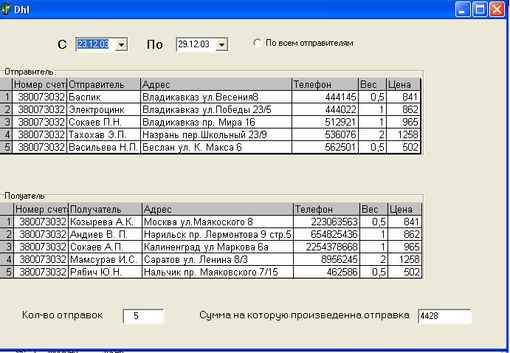 По нажатию на кнопку “По всем отправителям”, происходит вывод данных по всем имеющимся отправкам за указанный промежуток времени. Данные выводятся в две таблице. Первая таблица – таблица отправителя. Вторая – получателя. Под таблицей выводятся количества отправок и общая сумма, на которую произведены отправки.