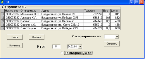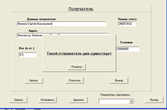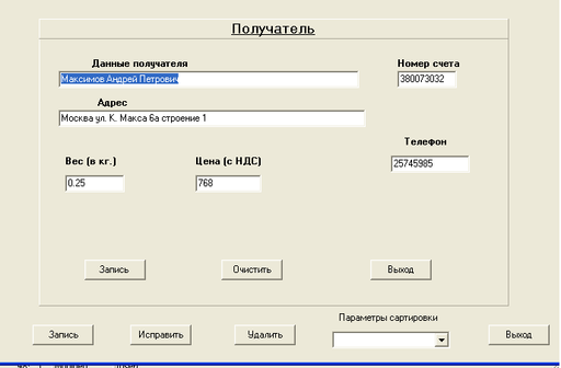 При необходимости упорядочивания данных, по какому – либо из полей, был предусмотрен выплывающий список выбора параметров сортировки. И, наконец, для завершения работы с формой “Получатель”, достаточно нажать кнопку «Выход», или кнопку закрытия окна, и пользователь попадает на форму главного меню.