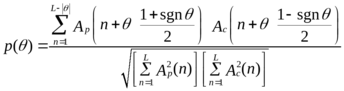 где Ар и Ас – отсчеты реальной и синтетической трасс; L – длина сравниваемых трасс; п – номер отсчета сравниваемых трасс; = –(L–1), –(L–1)+1, …, (L–1) – сдвиг. Из формулы видно, что р() [-1, 1], причем случай р = ±1 соответствует полному подобию АP(t) и Ас(t) с точностью до полярности, а р=0 – полной их некоррелированности.