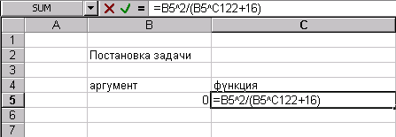 Уравнение (2) запишем в клетку С5, начиная со знака равенства, а вместо переменной x укажем адрес клетки В5, которая содержит значение начального приближения решения.