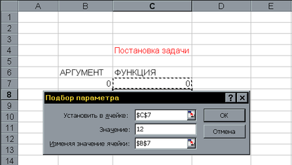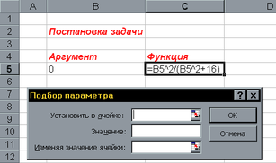 Выполнить команду Сервис/Подбор параметра… (получим лист электронной таблицы, как показано на рис.2)
