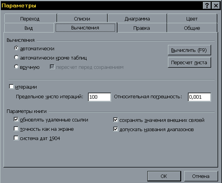 Численные методы решения хороши тем, что можно получить приближенное решение с заданной точностью. EXCEL имеет возможность управлять выбором точности. Для этого надо выполнить команду Сервис/Параметры/Вычисления и в соответствующих полях установить значения относительной погрешности и количества итераций(рис.5.).
