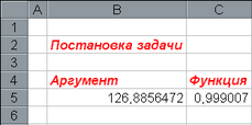 осле нажатия на кнопке ОК появится окно Результат Подбора Параметра, в котором дается информация о том, найдено ли решение, чему равно и какова точность полученного решения. Для нашего примера Результат Подбора Параметра показан на рис.4. При значении аргумента 126,8856472 функция, стоящая в левой части уравнения (2) равна 0,999007196. Достигнутая точность удовлетворяет.