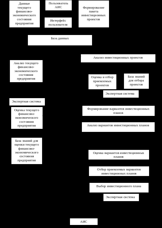 Следующим этапом будет проведение анализа сформированных планов путем прогнозирования деятельности предприятия и расчета основных показателей деятельности предприятия в случае реализации того или иного варианта плана. Входящая в состав разрабатываемой АИС экспертная система способна самостоятельно выбрать инвестиционный план, наилучшим образом влияющий на развитие предприятия и позволяющий достичь оптимальных значений основных технико-экономических показателей его деятельности.
