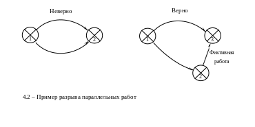 Два события сетевого графика может соединять только одна работа. Если все же имеет место факт соединения двух событий несколькими работами, то, для выполнения указанного правила, необходимо ввести дополнительные события, разрывающие лишние работы и дополняющие их фиктивными работами с нулевой длительностью (см. пример на рис. Error: Reference source not found). Дополнительные события также должны иметь свои уникальные, в сетевом графике, номера, присвоенные им в соответствии с первым правилом.