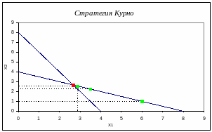 Рассмотрим две фирмы, i=1,2, выпускающие один и тот же товар. Пусть затраты i-й фирмы при выпуске x[i] равны a[i]*x[i] (таким образом, a[i] есть себестоимость выпуска одной единицы товара i-й фирмой). Произведенный обеими фирмами товар поступает на общий рынок. Цена на товар линейно падает в зависимости от поступающего на рынок общего его количества: p(x)=c-bx, c,b>0, где x=x[1]+x[2]. Следовательно, прибыль i-ой фирмы равна W[i](x[1],x[2])=x[i]*(c-bx)-a[i]*x[i]=bx[i]*(d[i]-(x[1]+x[2])),где d[i]=(с-a[i])/b. Поведение каждой фирмы определяется ее стремлением максимизировать свою прибыль.