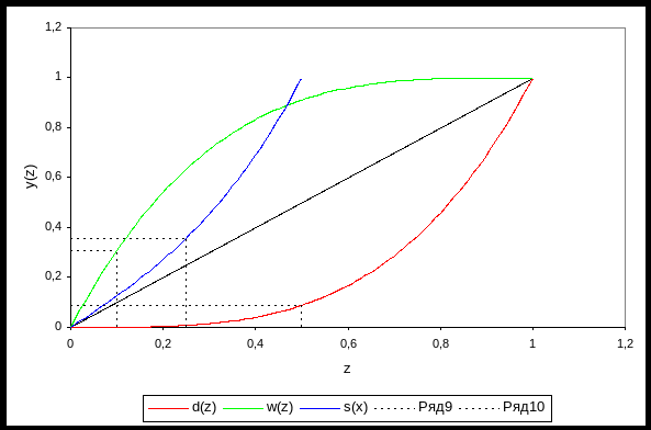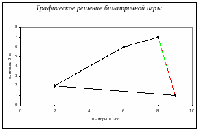 d[1]/2  Нанесем на плоскость x [1] x[1] прямые-множества стратегий фирм в ответ на известную стратегию другой фирмы x*[1]=(8-x[2])/2 и x*[2]=(8-x[1])/2 и найдем точку их пересечения. x[1],х[2]=d/3=8/3=2,67. Далее определим прибыли фирм W[1], W[2]=b*d2/9=9*64/9=64, p=c-2*b*d/3=77-2*9*8/3=29.  Теперь посмотрим, как действует модель Курно. Пусть 7,8 и 0,1 – выпуски фирм за прошлый год и каждая фирма знает этот выпуск своего конкурента. Тогда, зная его она применяет свою оптимальную стратегию с целью максимизировать прибыль. Убедимся, что после некоторого количества итераций они окажутся в точке Курно.  N  Выпуск  Цена  Прибыли  1-я фирма  2-я фирма  1-я фирма  2-я фирма  0  7,8  0,1 1 3,95 0,1 40,55 140,42 3,56 2 2,99 2,03 31,89 80,33 54,45 3 2,75 2,51 29,72 64,93 62,09  Как видно уже при 3-ей операции выпуски и прибыли 1-ой и 2-ой фирмы и цена значительно приблизились к точке Курно. Посмотрим это графически.    Зеленым цветом обозначены точки последовательных итераций, а красным – точка Курно.  Математической моделью конфликтов с двумя участниками являются биматричные игры. Такая игра 2х2 задается биматрицей (aij,bij) . В кооперативном варианте такой игры игроки могут согласованно выбирать элемент биматрицы. Если они выбрали элемент (a,b), то Первый игрок получает a , а Второй получает b . Цели игроков одинаковы - выиграть как можно больше в расчете на партию в среднем. Пусть (x,y), (a,b) - две точки из CE. Говорят, что (x,y) доминирует (a,b) если x>=a, y>=b и хотя бы одно из этих неравенств строгое. Недоминируемые точки называются оптимальными по Парето, а их множество - множеством оптимальности по Парето. Еще более узкое множество называется переговорным. Оно определяется так: пусть Vk - максимальный выигрыш, который k-й игрок может обеспечить себе при любой стратегии другого игрока, тогда переговорное множество определяется как множество тех точек множества Парето, у которых k-я координата не меньше Vk. Для нахождения Vk на до решить две задачи ЛП:  V1-->max, a11*x+a21*(1-x)>=V1,a11*x+a12*(1-x)>=V1, 0<=x<=1;  V2-->max, a11*y+a12*(1-y)>=V2,a21*y+a22*(1-y)>=V2, 0<=y<=1.  Дано:   биматрица  2  2  6  6  8  7  9  1 Нанесем на плоскость элементы биматрицы и начертим выпуклую оболочку.     Где красным и зеленым цветом обозначено множество оптимальности по Парето, а зеленым – та его часть, которая является переговорным множеством. V1=8, V2=4.  Цена игры первого игрока V1 находится легко, так как в матрице аij есть седловая точка а[2,1]=8. Основная теорема матричных игр утверждает, что для любой матричной игры max{min{M[P,Q]:Q}:P}=min{max{M[P,Q]:P}:Q}, т.е. во множестве смешанных стратегий есть седловая точка, дающая оптимальное решение игры. Поэтому V1= а[2,1]=8, а оптимальная стратегия 1-го игрока Р*=(0 1), так как ему выгодно выбирать все время 2-ю строку.  Для того, чтобы найти цену игры и оптимальную стратегию 2-го игрока необходимо решить задачу ЛП. Если все разделить на V2 и сделать замену переменных, то получим:  V2-->max y/V2=x1 x1 + x2 min  2*y+6*(1-y)>=V2, (1-y)/V2=x2 2*x1 +6*x2>=1  7*y+1*(1-y)>=V2, 7*x1 +1*x2>=1  0<=y<=1. x1, x2 ≥0  Решая ее находим V2=4.  Итак, цена игры 2-го игрока V2=4  Такой моделью является так называемая «диаграмма или кривая Лоренца».  Рассмотрим функцию распределения богатства в обществе d(z), которая сообщает, что z-я часть самых бедных людей общества владеет d(z)-й частью всего общественного богатства. Далее приведен график функции d(z). Площадь заштрихованной линзы называется коэффициентом Джинни J. Эта величина не более 1/2. Чем она меньше, тем равномернее распределено богатство в обществе. При J>0.2 распределение богатства 