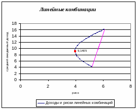 Пусть Q1 и Q4 две финансовые операции со средним ожидаемым доходом 4,2 и 16,25 и рисками 5,19 и 6,12 соответственно. Пусть t - какое-нибудь число между 0 и 1 . Тогда операция Qt=(1-t)Q1+tQ4 называется линейной комбинацией операций Q1,Q4. Средний ожидаемый доход операции Qt равен M[Qt] = 4,2* (1-t) + 16,25*t, а риск операции Qt равен rt =(26,94*(1-t)2+37,44*t2). Была найдена операция Q*, являющаяся линейной комбинацией исходных операций, со средним ожидаемым доходом 9,14 и риском 3,96, которая превосходит все имеющиеся операции по риску.