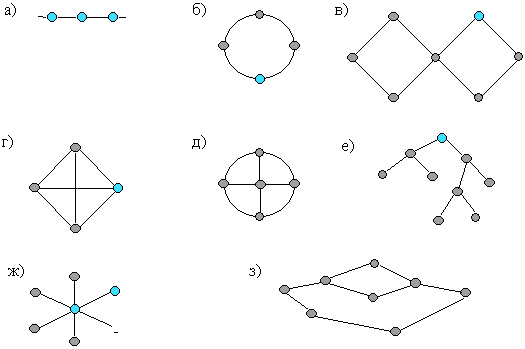 Линейная структура (рис.1.5,а) характеризуется тем, что каждая вершина связана с двумя соседними. При выходе из строя хотя бы одного элемента (связи) структура разрушается.