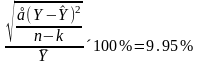 Полученный тренд изображен на графике (1) .Однако видно,что отклонение фактических уровней от расчетных довольно велико.Об этом же говорит довольно большое ср.квадратическое отклонение (6.1) .Рассчитаем ошибку тренда в процентах по формуле :