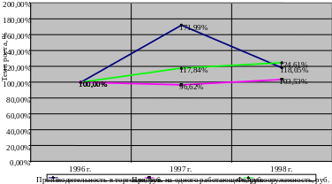 Значительно заметна производительность в торговли, за 1996 – 1998 г. она возросла на 76 954,4 рублей на человека (↑ на 103,4%).