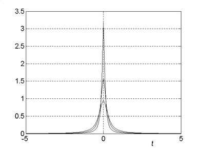 Последовательности функций, сходящиеся к единичной ступенчатой функции и к -функции при одинаковых значениях параметра , показаны на рисунках 1 и 2 соответственно.