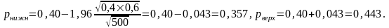 Пример. Пусть n=500, m=200. Тогда p* =0,40. Найдем доверительный интервал для