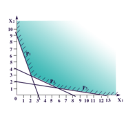 Подставляя координаты точки (0,0) в неравенства (1.8)-(1.10) видим, что начало координат им не удовлетворяет и, следовательно, не входит в множество планов Х. Поэтому штриховки направлены выше и правее граничных прямых. Выделяя точки, удовлетворяющие всем неравенствам и условиям неотрицательности, получаем множество планов, изображенное на рис. 1.2. В данном примере оно не ограничено.