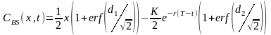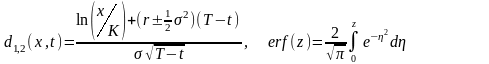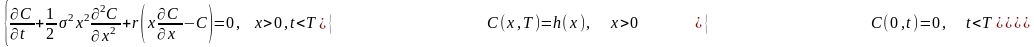 де х − ціна базового активу; t − час, що пройшов з моменту укладення опціонної угоди; C (x,t) − функція залежності ціни опціону на купівлю від ціни базового активу x та часу t; T − час дії опціонної угоди, вимірюється в роках; K − ціна реалізації опціону; r − безризикова ставка, що неперервно нараховується.