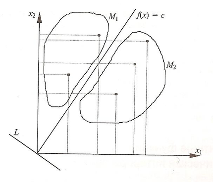 Перед тем как приступить к рассмотрению алгоритма дискриминантного анализа, обратимся к его геометрической интерпретации. На рис. 1 изображены объекты, принадлежащие двум различным множествам М1 и М2.