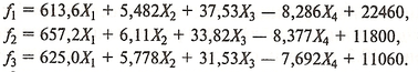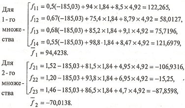 Рассмотрим, например, объекты с номерами 1, 2, З, 4. Для того чтобы отнести эти объекты к одному из двух множеств, рассчитаем для них значения дискриминантных функций (по трем переменным):
