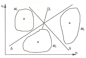 При необходимости можно проводить разбиение множества объектов на k классов (при k> 2). В этом случае нужно рассчитать k дискриминантных функций, так как классы будут отделяться друг от друга индивидуальными разделяющими поверхностями. На рис. 3 показан случай с тремя множествами и тремя дискриминантными переменными: