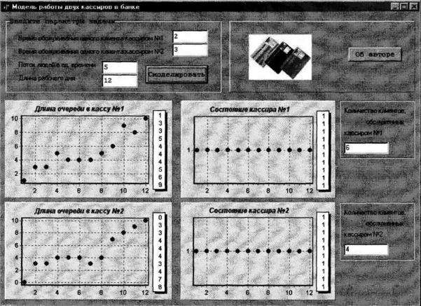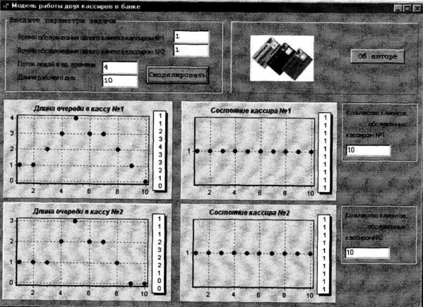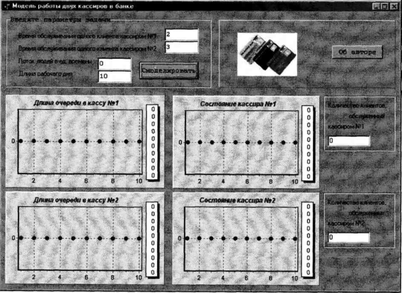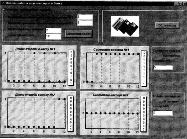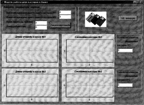 Далее (рис. 2) показана ситуация, когда в банк никто не приходил за все время его работы. Поэтому состояние кассиров всегда «свободен», длины очередей весь день = 0, а, следовательно, и количество обслуженных клиентов = 0. В этом случае стоит проверить, не заперты ли двери. Или лучше разрекламировать этот банк, а то так недолго и разориться.