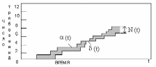 Число витікаючих з системи заявок (обслужених) на цьому інтервалі позначимо д(t). На малюнку 4 показані приклади функціональної залежності цих двох випадкових процесів від часу.