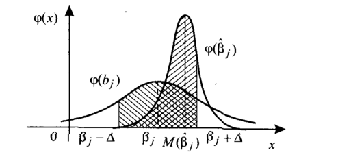Действительно, пусть максимально допустимый по величине доверительный интервал для оцениваемого параметра βj есть (βj-Δ, βj+Δ). Тогда доверительная вероятность, или надёжность оценки, определяемая площадью под кривой распределения на интервале (βj-Δ, βj+Δ), как нетрудно видеть из рисунка, будет в данном случае больше для оценки βj по сравнению с bj ( на рисунке эти площади заштрихованы). Соответственно средний квадрат отклонения оценки от оцениваемого параметра будет меньше для смещённой оценки, т.е.: