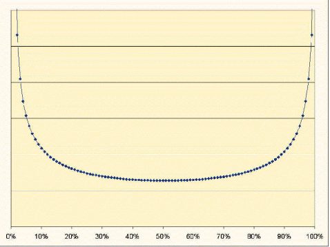 Вышеописанные характеристики случайных блужданий, описываются известным в статистике законом Арксинуса, применительно к нашему последнему примеру – это вероятность того, какую часть от всего отведенного времени точка находится на положительной или отрицательной стороне. Равенство - 50% на положительной стороне и 50% на отрицательной (интуитивно наиболееожидаемый сценарий) – имеет наименьшую вероятность, а максимальную вероятность – сценарий, при котором вся траектория находится либо на одной, либо на другой стороне.