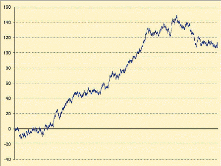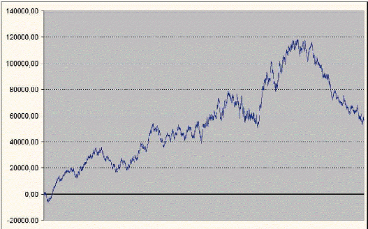 Тоже самое. Никаких колебаний вокруг 0 нет. Многие из таких траекторий будут опять же иметь тредовый вид. Растущие тренды в данном случае будут соответствовать выигрышным торговым системам.