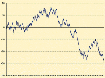 Все ответили, что счет будет колебаться вокруг нуля. Моделируем такую ситуацию. Возьмем S&P с 1991 года, дальше генерим вышеописанным способом столбец из 1 и –1, которые соответствуют длинной или короткой позициям. Посмотрим на варианты графиков сальдо нашего теоретического счета, управляемого случайной торговой системой.