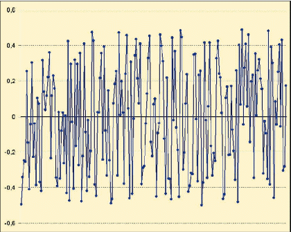 Это хаотическая, по крайней мере, внешне, траектория колебаний вокруг нуля в неком диапазоне. В нашем случае в диапазоне от –0,5 до 0,5. Это вполне соответствует нашим представлениям о том, как такой процесс может выглядеть. Дальше мы последовательно суммируем эти точки и получаем следующую картину.