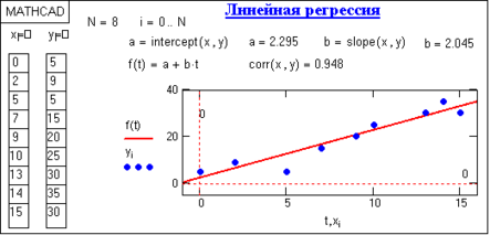 Реализация в Mathcad. Линейная регрессия в системе Mathcad выполняется по векторам аргумента Х и отсчетов Y функциями: