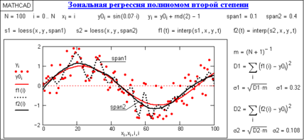 Зональная регрессия. Функция regress по всей совокупности точек создает один аппроксимирующий полином. При больших координатных интервалах с большим количеством отсчетов и достаточно сложной динамике изменения данных рекомендуется применять последовательную локальную регрессию отрезками полиномов малых степеней. В Mathcad это выполняется отрезками полиномов второй степени функцией loess(X, Y, span), которая формирует специальный вектор S для функции interp(S,X,Y,x). Аргумент span > 0 в этой функции (порядка 0.1-2) определяет размер локальной области и подбирается с учетом характера данных и необходимой степени их сглаживания (чем больше span, тем больше степень сглаживания данных).