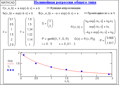 Регрессия общего типа. Второй вид нелинейной регрессии реализуется путем подбора параметров ki к заданной функции аппроксимации с использованием функции genfit(X,Y,S,F), которая возвращает коэффициенты ki, обеспечивающие минимальную среднеквадратическую погрешность приближения функции регрессии к входным данным (векторы Х и Y координат и отсчетов). Символьное выражение функции регрессии и символьные выражения ее производных по параметрам ki записываются в вектор F. Вектор S содержит начальные значения коэффициентов ki для решения системы нелинейных уравнений итерационным методом. Пример использования метода приведен на рис.2.3.2.