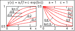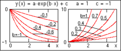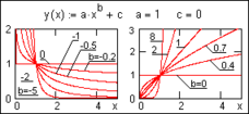 expfit(X,Y,S) – возвращает вектор, содержащий коэффициенты a, b и c экспоненциальной функции y(x) = a·exp(b·x) +c. В вектор S вводятся начальные значения коэффициентов a, b и c первого приближения. Для ориентировки по форме аппроксимационных функций и задания соответствующих начальных значений коэффициентов на рисунках слева приводится вид функций при постоянных значениях коэффициентов a и c.