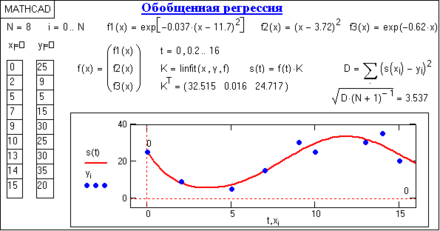 Линейное суммирование произвольных функций. В Mathcad имеется возможность выполнения регрессии с приближением к функции общего вида в виде весовой суммы функций fn(x):