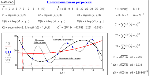 Одномерная полиномиальная регрессия с произвольной степенью n полинома и с произвольными координатами отсчетов в Mathcad выполняется функциями: