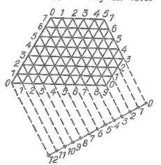 Рассмотрим старую головоломку с тремя сосудами, восходящую еще к Никола Фонтана, итальянскому математику XVI века. Восьмилитровый сосуд до краев наполнен водой. С помощью двух пустых сосудов объемом 3 и 5 литров воду надо поровну разлить в два больших сосуда. Диаграмма для этой задачи — ромбический стол размером 3х5 --- изображена на рис. 2. Главная диагональ рома поделенная наклонными прямыми на 8 частей, относится к 8-литровому сосуду. Как и в предыдущей задаче, бильярдный шар начинает свое движение из точки 0.