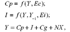 де Ср — обсяг приватного споживання; Y— обсяг ВВП; Ее, Ei —змінні, які характеризують вплив випадкових чинників на обсяги приватного споживання та обсяги інвестицій; І— обсяг інвестицій;Cg — обсяг державного споживання; NX— обсяг чистого експорту. Перше рівняння характеризує функціональну залежність між обсягом споживання, величинами національного доходу і чинниками стохастичної природи. Друге рівняння описує взаємозв'язок між обсягом інвестицій, поточним і попереднім національним доходом і впливом випадкових чинників. Третє рівняння — основна макроекономічна тотожність.