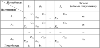 Имеется m пунктов отправления (производства) A1, A2, ... ,Am, в которых расположены запасы некоторого однородного продукта (груза). Объём этого продукта в пункте Ai составляет ai единиц. Кроме того, имеется n пунктов потребления B1, B2, ... ,Bn. Объём потребления в пункте Bj составляет bj единиц. Предполагается, что из каждого пункта отправления возможна транспортировка продукта в любой пункт потребления. Известна также стоимость cij перевозки единицы продукта из пункта Ai в пункт Bj .