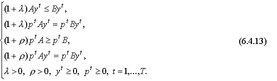 Основной предмет исследования Дж. фон Неймана - это возможность существования равновесия в рассматриваемой им динамической модели экономики при заданных в каждый момент ценах. Как следует из определения 5.2, при равновесии в условиях совершенной конкуренции имеет место стоимостной баланс (см. (5.3.8)). Таким образом, в условиях равновесия не создается никакой прибыли, и неравенство (6.4.6) является отражением этого факта. Поэтому, если в (6.4.6) для некоторого базисного процесса j имеет место строгое неравенство, т.е. предложение превышает спрос: