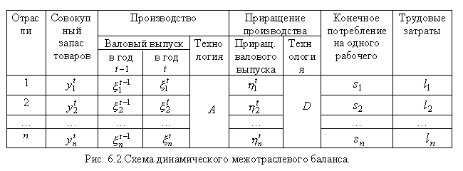 и при постоянных технологиях производства и его приращения показывает схема динамического межотраслевого баланса (рис. 6.2). Эта схема составляется для каждого года