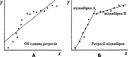 Іноді вибірка спостережень складається з двох або більше підвибірок, і важко встановити, чи слід оцінювати одну об’єднану регресію або окремі регресії для кожної підвибірки [ДОУ, с. 282]. На практиці проблема вибору стоїть звичайно не так жорстко, оскільки можуть бути деякі можливості об'єднання підвибірок при використанні відповідних фіктивних змінних і фіктивних змінних для коефіцієнта нахилу, щоб зробити менш строгим припущення про те, що всі коефіцієнти повинні бути однаковими для кожної підвибірки. До цього питання ми ще повернемося.