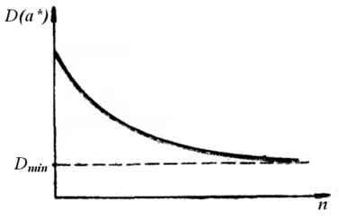Якщо зі збільшенням обсягу вибірки дисперсія оцінки прагне до будь-якого граничного (мінімального) значення, наприклад, як на рис. 2, оцінка називається асимптотично ефективною.