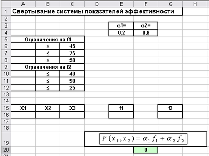 Внесем данные на рабочий лист в соответствии с Рис. 5.1. Под значения переменных отведем ячейки A16:C16. В ячейки A6:A8 и A10:A12 введем формулы, определяющие ограничения на значения переменных, в ячейки E16 и G16 – формулы для расчета соответствующих целевых функций, в ячейку F20 – формулу для расчета функции