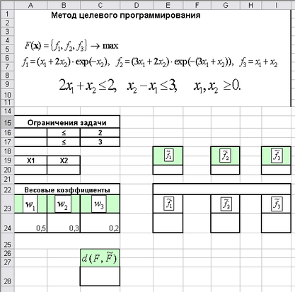 Отведем под значения переменных ячейки A20 и B20; введем формулы, определяющие ограничения задачи, в ячейки A16:A17; формулы для расчета функций