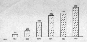 Мировая добыча природного газа имеет тенденцию к постоянному росту (см. рисунок 2). В 1990 году она превысила 2,5 трлн. м3, но реально — за вычетом потерь и закачки в пласт — составила 2060 млрд. м3. Прогнозы говорят о том, что к 2000 году она возрастет до 2,5—2,6 трлн. м3.
